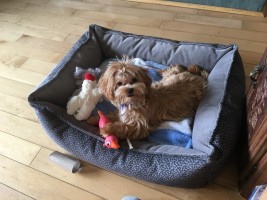 Voici une photo de notre petite Lilli dans le confort de sa maison qu’elle a elle-même organisée. Merci pour vos conseils pour le Pipipad et les sorties à l’extérieur. Ça va vraiment bien.