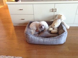 Voici princesse Pounette dans son panier. Notre pitou retraitée prend 3 marches par jour autour de la bâtisse et près du lac. Elle adore le gazon et les bonbons pour chien. Tranquille et affectueuse , elle  s'habitue tranquillement à sa nouvelle vie. Elle reste dans son panier la nuit et on peu la laissé libre dans l'appartement si on quitte pour de courte période .Elle mange peu , mais j'imagine que ça va se placer. Elle dort beaucoup ,ce qui me semble normal en raison de l'énorme changement qu'elle traverse. Quel beau projet de retraite pour elle et pour moi. Je te donne des nouvelles plus tard.