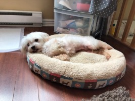 Elle est ici plongée dans la nouveauté. Tout lui est non-familié et étrange. Forcément, ça la fatigue beaucoup. Elle ne se fait pas prier pour faire la sieste. Elle est toujours à courte distance de ma présence, car je suis sa sécurité. Elle adore se faire prendre et je ne l’en prive pas. Elle est si petite, si douce et légère. Un vrai bonheur de la tenir contre moi. Oui, tu l’auras deviné, elle dort dans mon lit. Je lui ai construis une rampe d’accès. Il y a des coussins et des lits pour petits chien un peu partout dans la maison. En vraie pantouflarde qu’elle est, elle les a tous essayé et aimé, moyennant que je sois tout près. Elle a maîtrisé les escaliers en 2 jours. Une vraie pro! Bien sûr, elle était motivée par le besoin de me suivre sur les talons, la coquine. Crois-moi, si l’obstacle est trop grand, elle se fait entendre. C’est mon petit chien de poche. Autant il y a de coussins par-terre pour son confort, il y a des pee-pad aussi. Elle a encore des accidents, mais le plus souvent, elle se soulage sur le pee-pad avec succès. Elle sort dehors régulièrement où elle sait qu’il faut se soulager. Donc, pour les #2, c’est rare qu’elle les fait dans la maison. Pour son alimentation, tout va bien. Je lui donne une combinaison de nourriture sèche (Fromm) avec de la nourriture humide (Blue en canne). Elle adore, mais mange avec modération. C’est normal dans ce bouleversement qu’est sa vie actuellement. Elle prend sa marche quotidienne, de plus en plus à l’aise avec le harnais et la laisse. Certes, elle zigzague beaucoup, mais je comprends. Il y a tellement d’odeur et de bruit étrange dans ce nouveau décor, elle ne sait plus où donner de la tête, petit cœur.