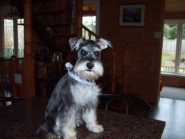 C'est la fille du lac qui a acheté une petite Schnauzer au mois de septembre. Je te donne des nouvelles de Maggie. Elle est adorable, déjà propre, très docile et intelligente. Elle s'entend à merveille avec Charly, mon mâle. Elle pèse déjà 10 lbs, tout le monde la trouve jolie même sa coiffeuse voulait la garder. Il n'en n'était pas question. C'est mon amour de petit chien, c'est mon bébé. Je t'envoie des photos.