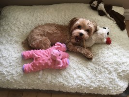 Elle est tellement mignonne! J’en suis dingue .   Après le décès de ma Doudoune il y a deux ans et demie, je ne voulais plus de toutou , tellement ont était attaché à nôtres petit caniche abricot !  Et là, le 28 Avril 2022 , j’aie craqué pour cette magnifique petite chienne de 6.7 lbs.   Zooky