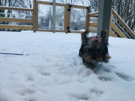 Elle a finalement appris à monter et descendre les marches, ce qui fait une grande différence car elle peut suivre ma plus jeune partout dans la maison.  Elle a aussi commencé à jouer avec ses jouets et à s’énerver à tous les matins, ce qui nous fait bien rire.  Je prends ça comme un signe que ça va mieux pour elle.  On continue de lui donner du Prozac pour gérer son anxiété, en espérant un jour pouvoir arrêter lorsqu’elle sera complètement adaptée à sa nouvelle vie.