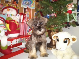 Je te souhaite de passer de Joyeuses Fêtes, une bonne année 2014 ainsi qu'une bonne continuité avec ton élevage ou plutôt ta mission parce que tu es là pour eu 24/24hrs à leur donner les meilleurs soins, ce n'est pas rien lollll ! Et merci beaucoup pour tout le bon service et les nombreux conseils que tu nous a donnés. J'ai adopté ce petit schnauzer le 7 décembre 2013 que j'ai nommé Théo, il vient tout juste d'avoir ses 3 mois. Il est très intelligent et très en forme, je crois qu'il s'est senti chez lui dès les premiers instants de son arrivée, bien sûr il a inspecté les lieux assez minutieusement, mais maintenant quand on sens un coup de vent passé et bien c'est Théo hi ! hi !!! Il s'est très bien intégré et même avec les ti-mousses de mon service de garde... Quand c'est l'heure de la sieste pour les tous petits, il ne dérange pas du tout il fait la sieste lui aussi et se lève en même temps qu'eux, les enfants l'adores lolll !!! Il est pas trop jappeur juste correct pour faire son rôle de gardien. Il commence a comprendre pour ses besoins donc c'est merveilleux !
