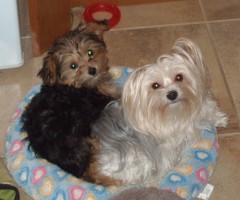 Voici nos 2 petites filles. Celle argentée se nomme Lulue et la noiraude, Rosie. Tu dois être fière de les voir ces 2 amours. À trois mois, Rosie est presque de la même taille que Lulue et je me demande si sa mère n'est pas une caniche royal !!! Trois mois et elle est vraiment forte et pèse 3 livres alors que Lulue ne fait que 5 livres et elle a 2 1/2 ans. Elles sont vraiment extraordinaires, merveilleuses et propre. Avec l'achat d'un enclos que nous avons fait chez toi, je peux t'affirmer que ça nous a aidé énormément. Elle est propre ma Rosie, oui déjà  et elle n'a que 3 mois !!!